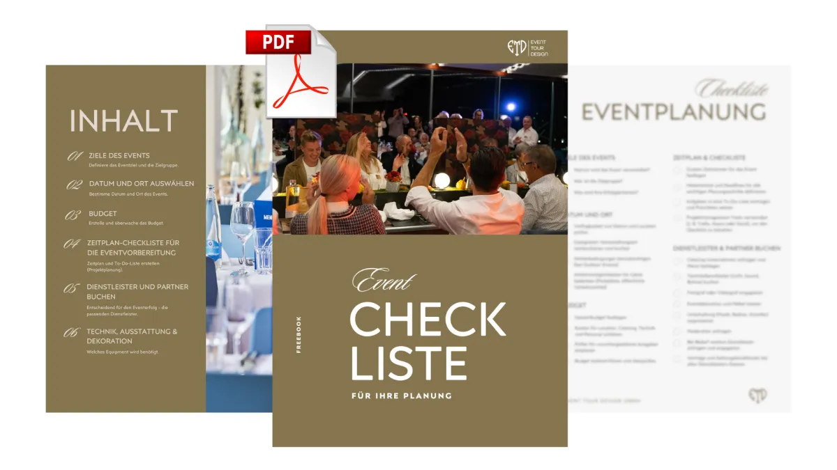 Die Checkliste ist mehr als eine To-Do-Liste – sie enthält bewährte Profi-Insights, die Ihnen helfen, ein Event zu planen, das sowohl Sie als auch Ihre Gäste beeindruckt. Plus: Ein kostenloser Beratungscall für individuelle Fragen!